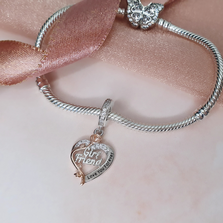 Beautiful and high quality 925 sterling silver 'Girlfriend' heart shaped dangle charm decorated with a rose gold plated rose flower and sparkling clear cubic zirconia stars. The heart is inscribed with 'Love You Forever'; a gorgeous gift for your Girlfriend on a special occasion to show her how loved she is.